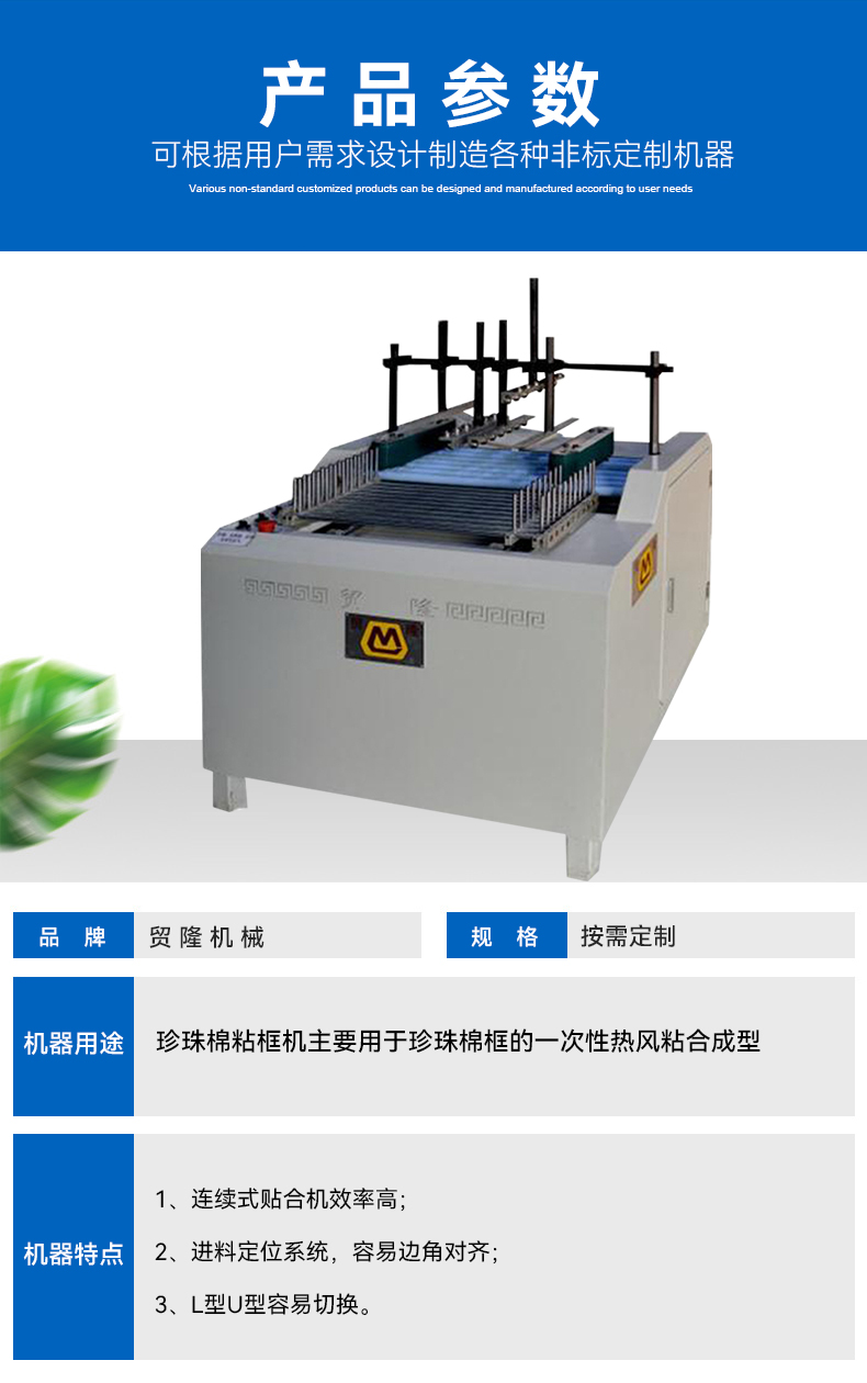L粘合机 产品简介 突出优势 工作原理 技术参数 应用物料 在线留言 L粘合机 产品简介: 珍珠棉粘框机主要用于珍珠棉框的一次性热风粘合成型 应用范围:针对珍珠棉条的一次热风粘合成型 物 料:珍珠棉条 设备咨询 索取报价 突出优势 1.连续式贴合机效率高; 2.进料定位系统,容易边角对齐; 3.L型U型容易切换。 工作原理 连续式贴合机效率高; 2.进料定位系统,容易边角对齐; 3.L型U型容易切换。 技术参数 应用物料 珍珠棉加工 纸板切割 eva切割机材料 在线留言 * 您的称呼: *联系电话: 使用地区: 请选择 北京市 上海市 天津市 重庆市 河北省 山西省 内蒙古自治区 辽宁省 吉林省 黑龙江省 江苏省 浙江省 安徽省 福建省 江西省 山东省 河南省 湖北省 湖南省 广东省 广西壮族自治区 海南省 四川省 贵州省 云南省 西藏自治区 陕西省 甘肃省 宁夏回族自治区 青海省 新疆维吾尔族自治区 香港特别行政区 澳门特别行政区 台湾省 其它 市: 请选择 产品类别: 请选择 珍珠棉切割设备 珍珠棉粘合设备 珍珠棉开槽设备 涂胶设备 其它 产品型号: 请选择 电子邮箱: 简单描述: