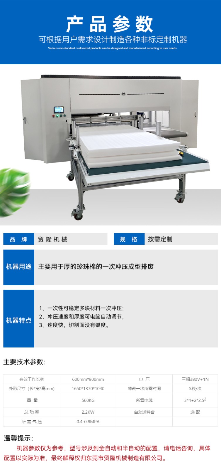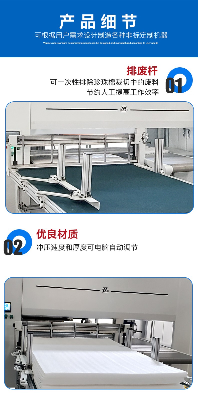 珍珠棉冲裁排废一体机 产品简介 突出优势 工作原理 技术参数 应用物料 在线留言 珍珠棉冲裁排废一体机 产品简介: 主要用于厚的珍珠棉的一次冲压成型排废 应用范围:珍珠棉冲裁一体机 物 料:珍珠棉粘冲裁 设备咨询 索取报价 突出优势 1.珍珠棉冲裁一体机一次冲压成型排废,省掉二次人工排废;2.280mm高的材料不变形。 工作原理 一次性可稳定多块材料一次冲压;冲压速度和厚度可电脑自动调节;速度快,切割面没有弧度。 技术参数 应用物料 珍珠棉加工 纸板切割 eva切割机材料 在线留言 * 您的称呼: *联系电话: 使用地区: 请选择 北京市 上海市 天津市 重庆市 河北省 山西省 内蒙古自治区 辽宁省 吉林省 黑龙江省 江苏省 浙江省 安徽省 福建省 江西省 山东省 河南省 湖北省 湖南省 广东省 广西壮族自治区 海南省 四川省 贵州省 云南省 西藏自治区 陕西省 甘肃省 宁夏回族自治区 青海省 新疆维吾尔族自治区 香港特别行政区 澳门特别行政区 台湾省 其它 市: 请选择 产品类别: 请选择 珍珠棉切割设备 珍珠棉粘合设备 珍珠棉开槽设备 涂胶设备 其它 产品型号: 请选择 电子邮箱: 简单描述: